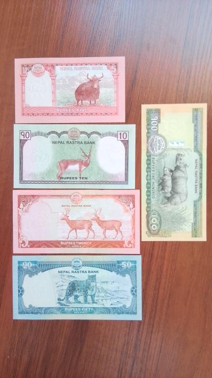 Набор из 5 купюр Непала номинплом 5, 10, 20, 50 и 100 рупий. Кррме 20ки все UNC.