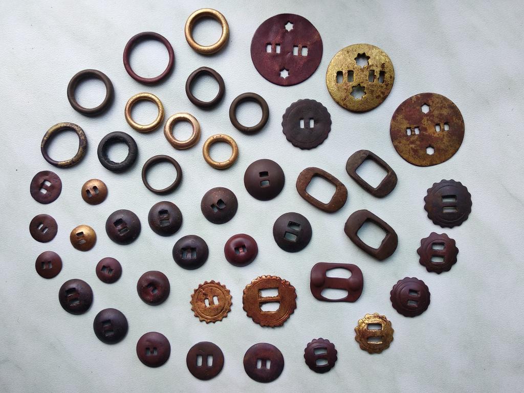 Набор элементов конской сбруи (бляхи разные, полупряжки, кольца шлейные). Лот состоит из 45 предметов. Продается только набором, по отдельности элементы не продаются. Оригинал. Большая часть в родной патине.
